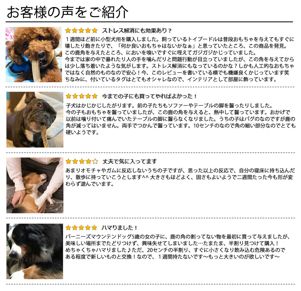 【口臭予防・デンタルケアに最適】 犬のおもちゃとして、プラスチック製品はすぐ飽きる。木製のかじり棒や、豚の皮は、すぐ小さくなったり、食べ終わってしまう。牛の蹄は、匂いが臭いし、呑みこみの怖れも。そんな悩みにお答えするのは、長く噛み噛みできて、呑みこみの恐れも少ない、鹿角がおススメです。鹿角を噛むことで、唾液が沢山出ることで、口内の細菌の増殖も抑えられ、歯や歯茎を刺激して、歯磨き効果もございます。